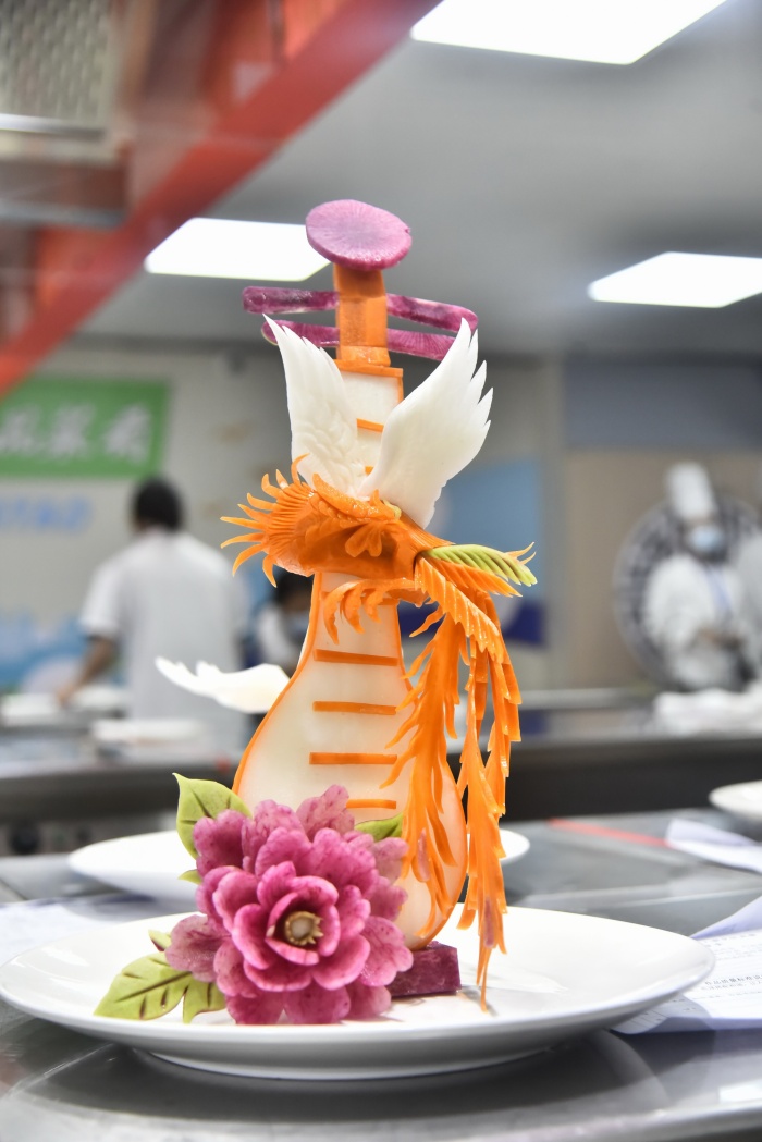 比賽凸顯職教特色,為省內(nèi)各中職學(xué)校之間專業(yè)建設(shè)提供交流與成果檢驗的平臺。烹飪賽項由理論和實操兩大項目組成,實操項目分為四個模塊:粵菜制作、廣點制作、主題拼盤和食品雕刻,主要考察選手對粵菜、廣點基本功的知識和技能掌握程度。模塊一:粵菜制作,參賽選手在 115 分鐘內(nèi)完成五彩炒雞絲、骨香鴿片和自選作品制作;模塊二:廣點制作,參賽選手在 150分鐘內(nèi)完成提褶包、嶺南酥皮作品(烤制)和自選作品的制作;模塊三:主題拼盤制作,參賽選手在63分鐘內(nèi)完成剞切蓑衣黃瓜和自選作品的制作;模塊四:食品雕刻,參賽選手需要在67 分鐘完成基本功作品月季花和自選作品的制作。自選作品需符合地方粵菜飲食文化特色和烹飪技法特點,展示選手技術(shù)創(chuàng)新和學(xué)以致用方面的技巧與能力。
