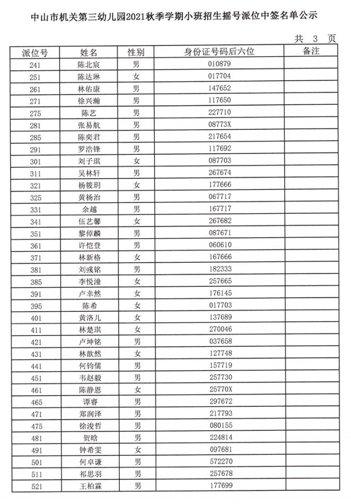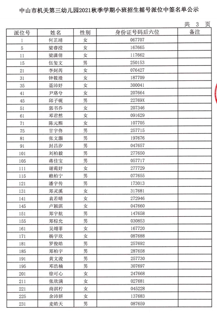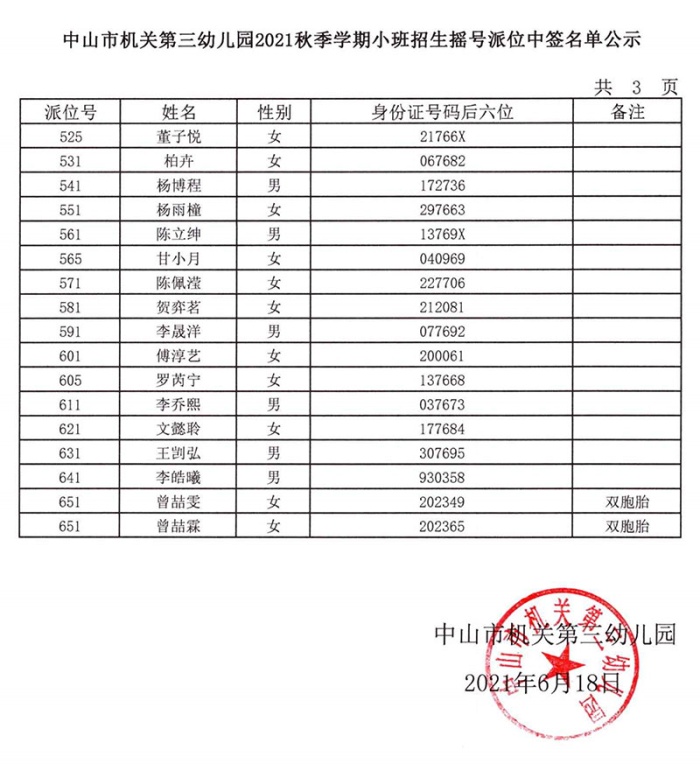 中山市機關(guān)第三幼兒園2021年秋季學(xué)期小班招生搖號派位中簽名單公示