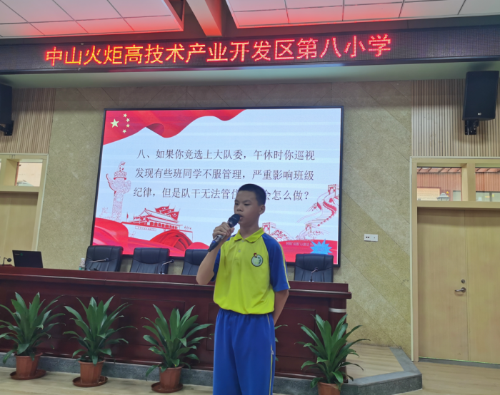 在活動過程中,每一位候選人在精心準備下隆重登場,他們的競選演講或激情昂揚,或字字鏗鏘,盡情抒發(fā)對少先隊大隊委職務的向往,表達了自己對服務學校、服務同學的強烈意愿。他們紛紛表示,加入大隊委后,將進一步嚴于律己,處處做好先鋒榜樣作用,發(fā)揮組織才能,以充分的責任感參與到少先隊活動中來。此次活動最精彩的莫過于現(xiàn)場答辯環(huán)節(jié),此次答辯采取現(xiàn)場抽簽選題,題目圍繞大隊委日常工作中常遇到的困境或難點,讓候選人現(xiàn)場限時作答,旨在考核他們的責任感、應變能力及表達能力。這個環(huán)節(jié)充分引起了候選人及在場所有少先隊員代表們的興趣與思考,候選人精彩的回答也贏得了現(xiàn)場陣陣掌聲。