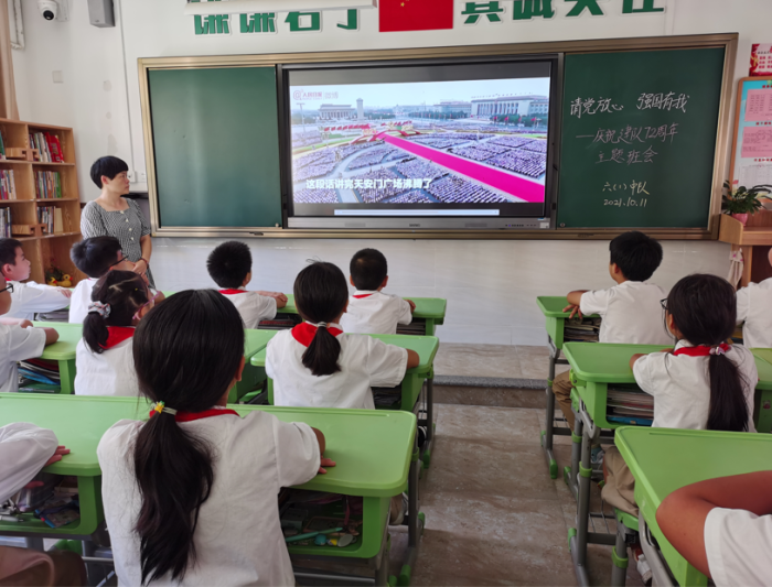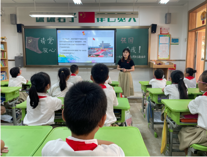 在主題班會(huì)上,中隊(duì)輔導(dǎo)員帶領(lǐng)隊(duì)員們重溫了7月1日上午在北京天安門廣場(chǎng)隆重舉行的慶祝中國共產(chǎn)黨成立100周年大會(huì)的視頻,“請(qǐng)黨放心,強(qiáng)國有我!”是在這個(gè)大會(huì)上發(fā)出的青春誓言,響徹神州大地,這是“后浪”奔涌的時(shí)代潮音,是開創(chuàng)未來的青春擔(dān)當(dāng)。隊(duì)員們聚精會(huì)神地觀看著歡慶中國共產(chǎn)黨百歲生日的盛大儀式,立志傳承紅色基因,樹立強(qiáng)國夢(mèng)想,增長(zhǎng)本領(lǐng)才干。