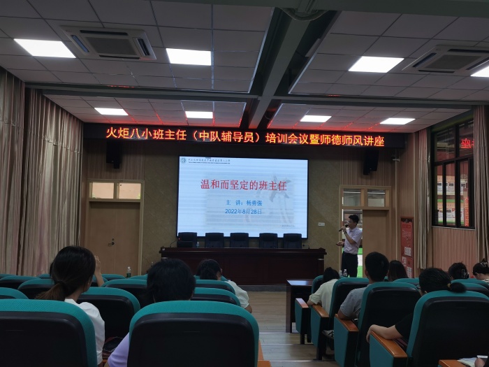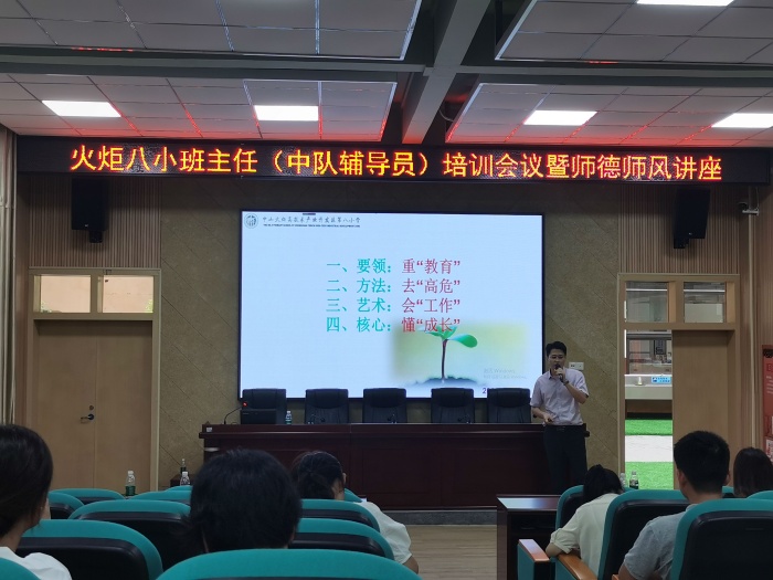 “師也者,教之以事而喻諸德也”,為加強(qiáng)班主任隊(duì)伍建設(shè),落實(shí)立德樹人根本任務(wù),建立良好的家校關(guān)系,家校共育,共促學(xué)生成長(zhǎng),火炬八小于8月28日下午在報(bào)告廳開展德育專題講座暨班主任(中隊(duì)輔導(dǎo)員)培訓(xùn)會(huì)議。本次會(huì)議由學(xué)生服務(wù)室鄧龍主任主持,特邀請(qǐng)了中山市優(yōu)秀德育干部、中山市班主任專業(yè)發(fā)展研究中心成員、中山市家校共育研究中心講師團(tuán)副團(tuán)長(zhǎng)、火炬區(qū)第四小學(xué)楊勇強(qiáng)副校長(zhǎng)為全體班主任和新教師開展講座。