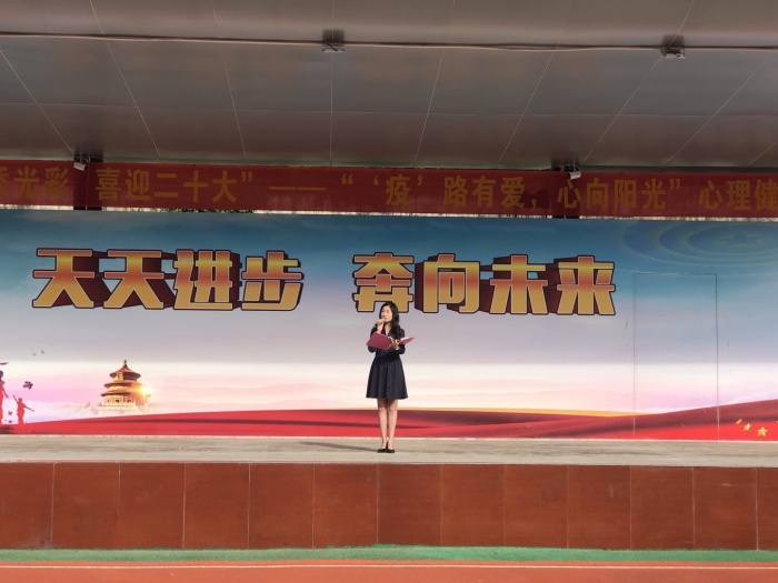 德育副校長馮麗芬在開幕儀式上向全體師生介紹、宣傳了心理健康的重要性,并用谷愛凌逆境奇襲的故事勉勵師生要積極向上,號召師生一起從思想上重視心理健康、行動上促進(jìn)心理健康,最后還分享了保持心理健康的小妙招。
