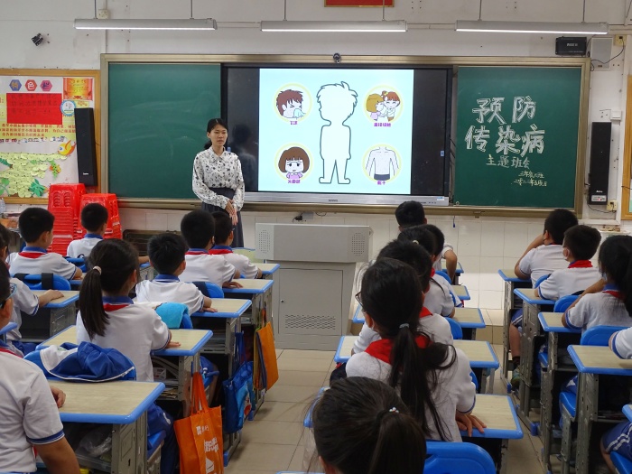 班會(huì)課上,老師首先從“什么是傳染病”入手,挖掘孩子們對(duì)傳染病的已知信息。接著,結(jié)合孩子們對(duì)傳染病知識(shí)的了解,著重介紹了“流行性感冒、流行性腮腺炎、流腦、手足口病、水痘、麻疹、結(jié)核病”等常見傳染病。通過問答、游戲等多種方式向?qū)W生們介紹了傳染病的傳播途徑、易感人群、危害,細(xì)致講解了針對(duì)常見傳染病的預(yù)防措施,如“勤洗手、勤洗澡、吃熟食、喝開水、勤通風(fēng)”等,加強(qiáng)學(xué)生對(duì)傳染病預(yù)防方面的知識(shí)教育。