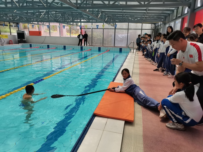 講座結束后,四4班的同學和老師來到恒溫游泳館,在教練員的現(xiàn)場講解和施救示范下,初步掌握了自救方法和施救方法。自救方法包括抓住周圍漂浮物,放松全身,讓身體漂浮在水面上,將頭部浮出水面,用腳踢水等。施救方法包括大聲呼救,找附近的大人求助;可以嘗試用木棍或繩子將溺水者拉至岸邊,但注意要保證自身的安全,可以趴在地上增加摩擦力,或者用障礙物做防護屏障,防止被反拖下水;為了爭取救援時間,還可以向溺水者拋擲木塊、塑料瓶等能漂浮于水面的物品,幫助他們保持在水面上呼吸;當落水者離岸較遠時應尋找救生圈、救生繩、木板等拋向落水者等。