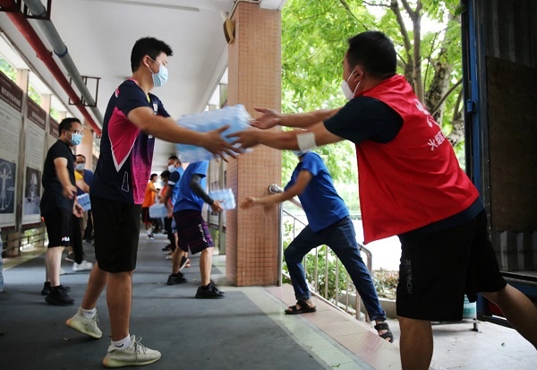7月25日,六小兩名黨員志愿者進(jìn)入集中安置點(diǎn),對(duì)隔離宿舍進(jìn)行物資分配及衛(wèi)生清潔。當(dāng)天高溫黃色預(yù)警,志愿者們的汗水早已把衣服浸透,卻依然堅(jiān)守崗位,打掃宿舍,完成生活物資的搬運(yùn)及分發(fā)。