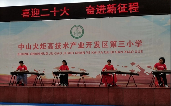 生在紅旗下,長在春風(fēng)里。少先隊員國旗下的快板表演《中國人》和古箏表演《大中國》,詮釋了火炬三小莘莘學(xué)子對黨和祖國的無盡深情。