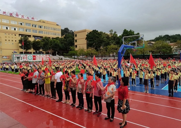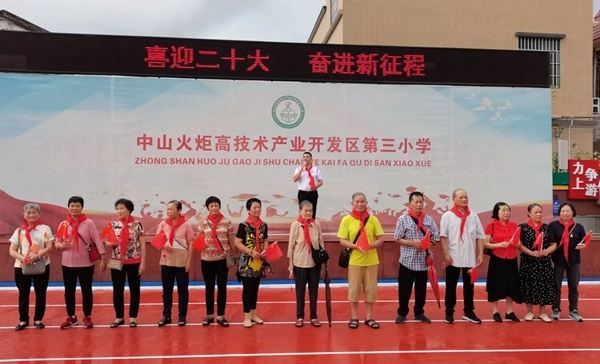 一朝沐杏雨,一生念師恩。在慶祝中華人民共和國成立73周年之際,火炬三小迎來了十幾位退休老教師的來臨,他們在這里培育了一代又一代的社會主義接班人,為祖國各個行業(yè)默默地培養(yǎng)人才。當(dāng)少先隊員們將鮮紅的紅領(lǐng)巾再次佩戴在他們胸前,大聲地說著:“老師,您好!”,所有老師心中涌起了幸福的浪花。