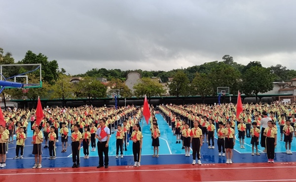 當(dāng)莊嚴(yán)的國歌伴隨著悠揚的旋律響起,同學(xué)們不約而同舉起了右手,唱著雄壯激昂的國歌,目睹著五星紅旗冉冉升起,英姿颯爽,整齊劃一。鮮艷的紅領(lǐng)巾在胸前隨風(fēng)飄揚,身為中華兒女的自豪之情在他們心中綻放。