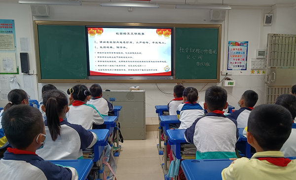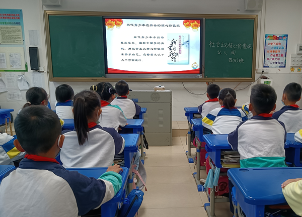 各班從愛國意識、文明意識、誠信意識、友善意識幾個方面,闡釋了當(dāng)代中小學(xué)生應(yīng)當(dāng)具備的核心價值觀。結(jié)合生活實際,師生共同探討了“校園中存在的不文明現(xiàn)象、怎么樣才能做到文明?”等問題,讓社會主義核心價值觀的真正意義在孩子心中得以內(nèi)化。