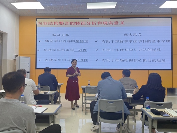 接著,劉老師帶來(lái)了“在課堂教學(xué)中落實(shí)核心素養(yǎng)發(fā)展——以圖形與幾何”教學(xué)為例”的主題講座。劉老師引導(dǎo)老師們?nèi)媪私?、?zhǔn)確把握新課程的實(shí)質(zhì)和主要變化,并結(jié)合教材中的題目,詳細(xì)解讀了數(shù)與代數(shù)、圖形與幾何、綜合與實(shí)踐、統(tǒng)計(jì)與概率領(lǐng)域在小學(xué)各階段的主要變化,幫助老師做到“心中有綱,胸中有本,手中有法”。同時(shí)著重強(qiáng)調(diào)了目標(biāo)要明確,注重系統(tǒng)性、整體性的原則,更好地促進(jìn)學(xué)生核心素養(yǎng)的發(fā)展。整場(chǎng)講座深入淺出,理論加實(shí)踐的解讀,給老師們帶來(lái)了諸多新的思考,指明了今后教學(xué)前進(jìn)的方向。