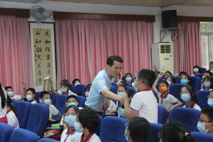 學(xué)生置身于綜合電教室內(nèi)聽(tīng)蔡校長(zhǎng)講思政課,全程都?xì)g呼雀躍地舉手發(fā)言,像在奔跑追光中的少年。直至最后,興高采烈地與蔡校長(zhǎng)一起高聲總結(jié)——