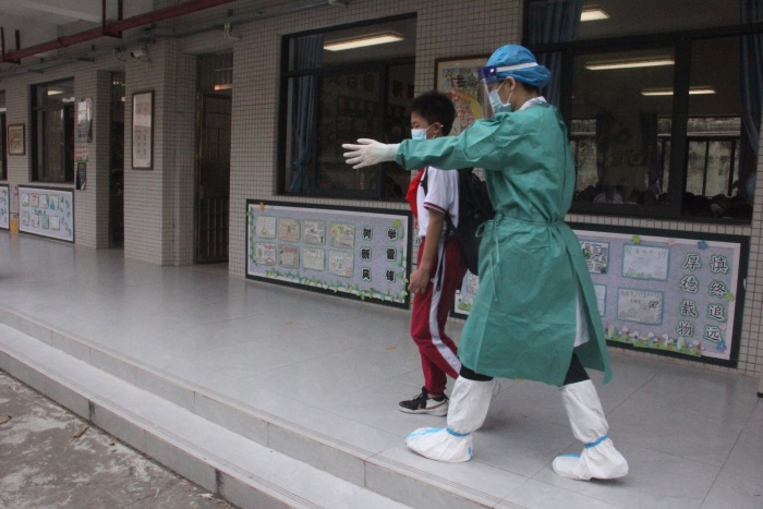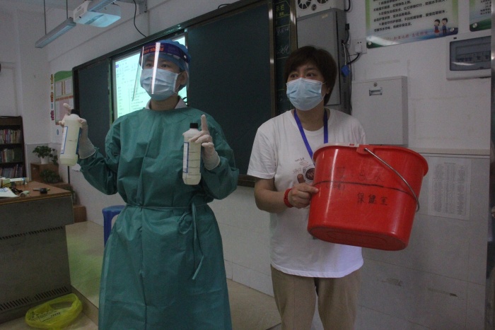 本次疫情防控應(yīng)急演練采取“情景模擬”方式,重點(diǎn)創(chuàng)設(shè)每日晨午檢發(fā)現(xiàn)體溫異常、上課期間學(xué)生嘔吐、學(xué)校出現(xiàn)陽(yáng)性病例密切接觸者等三種情境進(jìn)行模擬演練。早上8:30, 蔡長(zhǎng)青校長(zhǎng)宣布應(yīng)急處置演練正式開始。演練過程中,參演人員分工明確、配合緊密、反應(yīng)迅速,準(zhǔn)確高效地完成了各項(xiàng)預(yù)定演練任務(wù)。演練完畢,校醫(yī)梁醫(yī)生對(duì)上述三種情境作了進(jìn)一步的講解,使參與觀摩演練的老師受益匪淺,了解到更多的防疫小知識(shí),增強(qiáng)了對(duì)疫情突發(fā)問題的應(yīng)變和處置能力,為學(xué)校常態(tài)化疫情防控工作提供保障。