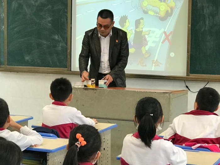 基于上述道路險阻,易老師針對少年兒童在道路上常見的不文明、不規(guī)范的交通行為順勢展開教導。他首當其沖強調“安全第一”。從最基本的走路入手,他就地取材以講臺上的粉筆盒形象地為學生展示如何通過紅綠燈、人行天橋和人行地下通道。他指出被人們忽視或自以為是的交通理解誤區(qū),如,騎自行車違規(guī)載人,騎自行車在機動車道上逆向行駛或并排行駛等。他還強調嚴禁未滿12周歲的兒童騎自行車上路,嚴禁不戴頭盔乘坐摩托車,嚴禁在道路上玩滑板。隨后,圍繞一個女生提出的問題:如果我們還沒到達安全區(qū),但是遇上紅燈怎么辦?易老師揭示不規(guī)范交通行為“往后退”的危險性,同時就這種情況給予學生正確的指引。為鞏固加深學生印象,易老師以兩個“一”收尾總結:生命只有“一次”,所以,務必牢記安全“第一”。