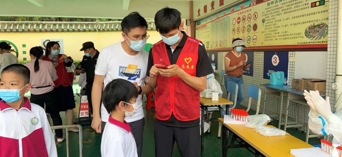 在后勤部陳玉苗主任的帶領下,各班班主任立刻組織與指導家長登錄粵核酸小程序登記學生信息,并上交最后生成的學生核酸碼。家長高度配合,迅速響應。在短短一小時內,學校已經(jīng)順利收集全校2000多名學生的核酸碼,為即將開展的學生核酸檢測充分鋪墊。同時,在各年級組長的帶動下,一支核酸檢測的教師志愿者隊伍也迅速組建起來,并快速投入到核酸檢測現(xiàn)場的布置工作中。