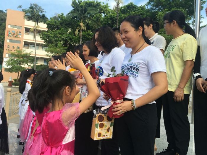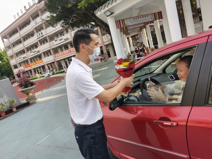 9月9日早上,校園里到處洋溢著溫暖的節(jié)日氛圍。每間教室的展板上都張貼著精美的手工作品。紙短情長,每一張作品都在訴說孩子們對(duì)老師的感恩之情。當(dāng)老師們踏進(jìn)校園時(shí),蔡長青校長帶領(lǐng)著少先隊(duì)員們有序地向辛勤工作的老師們送上鮮花:“老師,您辛苦了,節(jié)日快樂!”孩子們滿懷熱忱地向老師們表達(dá)自己的感激之情。此時(shí),鮮花的美好溫暖著每一位老師的心靈,笑容在老師的臉上綻放,幸福在老師的心中流淌。在這個(gè)特殊的日子里,每位老師都感受到作為一名人民教師的幸福感。