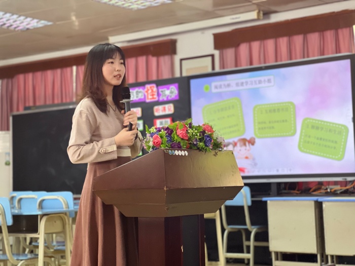 隨后,陳老師對如何提高孩子們的閱讀能力進行經(jīng)驗分享。陳老師從班級管理、家校協(xié)作等方面入手,引導(dǎo)老師們根據(jù)學(xué)生的年齡特點合理布置圖書角,利用有吸引力的圖書激發(fā)孩子們的閱讀興趣;根據(jù)語文教本選擇相對應(yīng)的繪本,拓展學(xué)生閱讀的廣度;加強家校溝通開展親子閱讀等活動,維護學(xué)生閱讀的深度。陳老師的分享可操作性強,干貨滿滿,讓在場的老師們受益匪淺。
