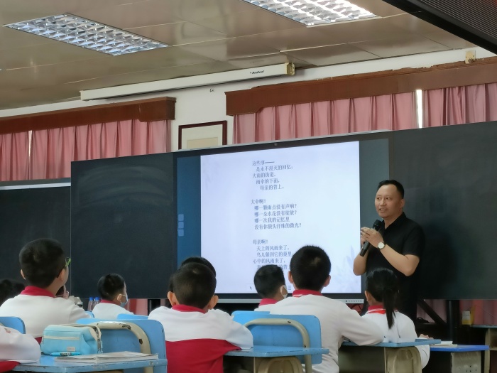 在這次活動(dòng)中,文自成老師給老師們帶來了一節(jié)《繁星》的詩歌教學(xué)。課堂上,文老師化繁為簡,用質(zhì)樸的語言、簡單的課件帶領(lǐng)四5班的孩子們領(lǐng)略《繁星》的特色,從橫向、縱向兩個(gè)思維角度讓學(xué)生在領(lǐng)略詩歌情感的同時(shí)感受詩歌語言特點(diǎn),讓學(xué)生圍繞事、景、情三方面進(jìn)行詩歌創(chuàng)作,引導(dǎo)學(xué)生發(fā)現(xiàn)詩歌中蘊(yùn)藏的美。在文老師全方位的指導(dǎo)下,學(xué)生有感而發(fā),現(xiàn)場(chǎng)創(chuàng)作詩歌佳作頻出,掌聲陣陣。整節(jié)課設(shè)計(jì)巧妙,詩意滿滿,是一節(jié)非常有指導(dǎo)性的示范課。
