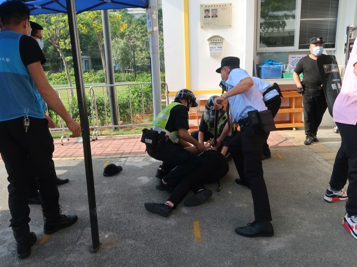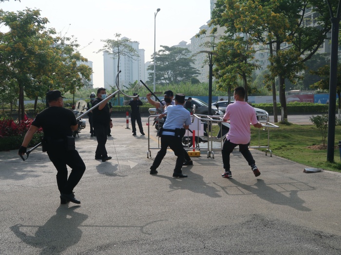 此次演練在全園幼兒和教師中展開(kāi),在駐校民警協(xié)助指導(dǎo)下,由安保公司人員假扮“歹徒”并手持兇器強(qiáng)行翻墻進(jìn)入幼兒園。幼兒園保安隊(duì)發(fā)現(xiàn)異常情況后立即啟動(dòng)報(bào)警系統(tǒng),并采取有針對(duì)性防暴力事件的各種措施,拿起鋼叉、鐵棍等勇敢地與“歹徒”進(jìn)行搏斗。各班老師組織正在操場(chǎng)上游戲的小朋友快速有序地就近疏散、避險(xiǎn)。最后“歹徒”在教師及保安人員的齊心協(xié)力下被成功制服,此次演練進(jìn)行得十分順利。演練后各班老師在安撫幼兒情緒的同時(shí)對(duì)幼兒進(jìn)行了安全教育。