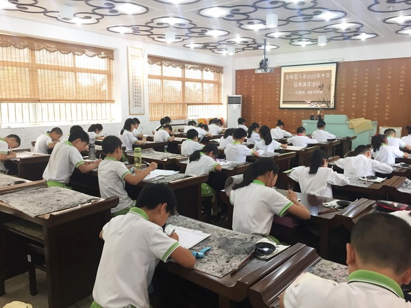 書法課堂上,同學(xué)們正襟危坐,專心致志地書寫古詩詞內(nèi)容。橫豎撇捺、起筆收筆,一篇篇清晰工整、優(yōu)美流暢的詩句躍然紙上,體現(xiàn)了中華經(jīng)典詩詞的對仗之美、韻律之美、意境之美。