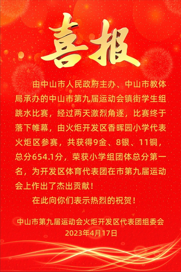4月15日-16日,中山市第九屆運(yùn)動(dòng)會(huì)鎮(zhèn)街學(xué)生組跳水比賽在中山市體育運(yùn)動(dòng)學(xué)校進(jìn)行,本次比賽吸引了來自全市各鎮(zhèn)街運(yùn)動(dòng)員參與角逐。開發(fā)區(qū)香暉園小學(xué)游泳隊(duì)代表火炬開發(fā)區(qū)參賽。游泳健兒積極備戰(zhàn),刻苦訓(xùn)練,在比賽中發(fā)揮頑強(qiáng)拼搏的精神,奮勇爭(zhēng)先,展現(xiàn)了極高的競(jìng)技水平和良好的精神風(fēng)貌,最終力壓群雄,共獲得9金、8銀、11銅,榮獲小學(xué)組團(tuán)體總分第一名。