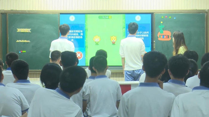 劉媛老師以代入研究人員角色為情境,引導學生思考如何批量、廉價生產(chǎn)胰島素。她以思考問題為切入點,設置五個課堂任務,鼓勵學生全員參與課堂互動和討論,融知識學習和社會實踐為一體。為達到鞏固知識的目的,劉媛老師利用希沃技術(shù),將枯燥的解題設置為扣人心弦的短跑比賽,讓溫故知新的復習過程充滿了競技的樂趣。