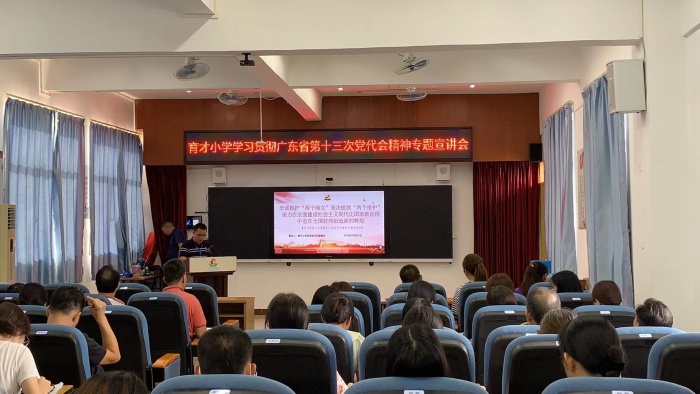 6月23日下午,育才小學(xué)黨支部在學(xué)校會議室召開教師大會進(jìn)行專題宣講,深入學(xué)習(xí)宣傳貫徹廣東省第十三次黨代會精神。學(xué)校黨支部書記、校長胡留全上專題黨課,全體教師參加會議。