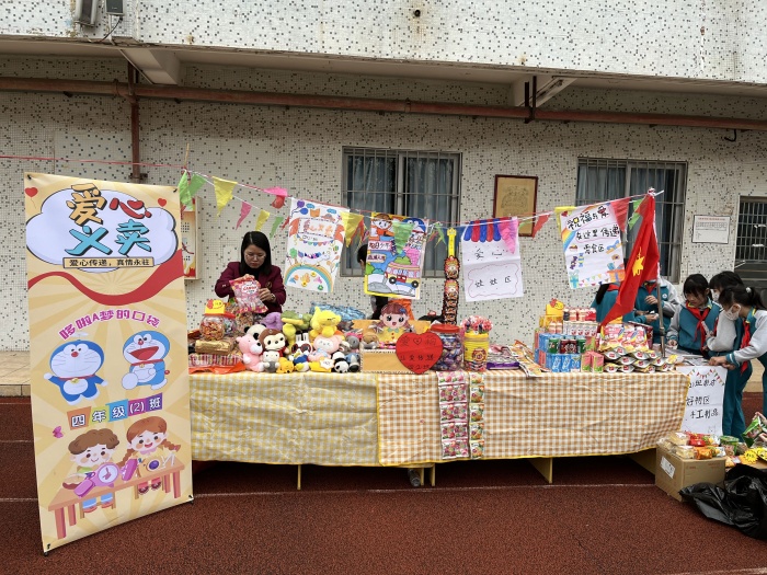 各班級(jí)在學(xué)校指定的區(qū)域內(nèi)搭建起了各自的商品攤位。攤位上有同學(xué)們平時(shí)閑置的玩具、圖書(shū)、文具、食品以及工藝品等,各類(lèi)義賣(mài)物品應(yīng)有盡有。