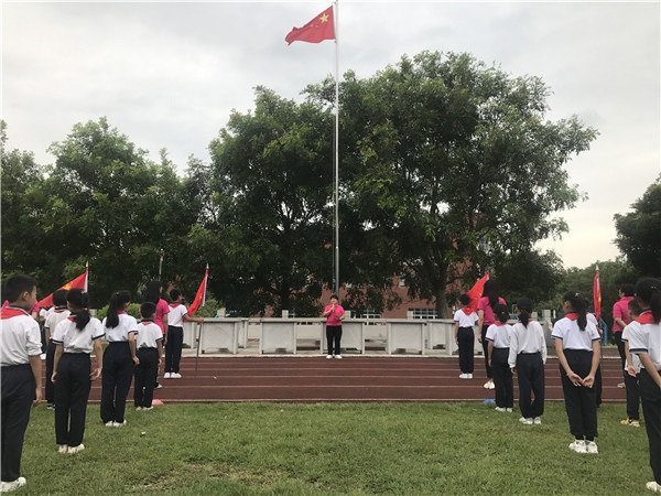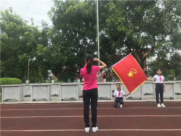 嘹亮的國歌聲奏響了活動的第一議程,全體少先隊員敬禮,向國旗致敬。緊接著,大隊干部踏著矯健的步伐,出大隊旗。國旗和隊旗迎風(fēng)飄揚(yáng),全體少先隊員在國旗和隊旗下唱響隊歌。