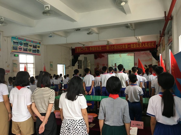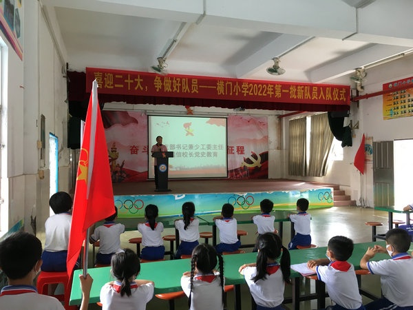 2022年5月31日下午,橫門小學落實分批入隊工作,為2022年第一批新隊員舉行了入隊儀式。在星星火炬旗幟下,一年級第一批共12名新隊員光榮地加入了中國少年先鋒隊。橫門小學黨支部書記、校長兼少工委主任林國信,還有其它少工委委員參加了該活動。在飄揚的隊旗下,在星星火炬的指引中,全體同學高唱《中國少年先鋒隊隊歌》。嘹亮的歌聲,唱出了每位同學心中的自豪與驕傲。隨后少工委辦公室主任、大隊輔導員鄭達明老師宣讀組建一年級少先隊組織的決定和入隊名單。緊接著,優(yōu)秀少先隊員代表上臺給一年級新隊員授紅領巾。在大隊輔導員的組織下,少先隊員們在隊旗下莊嚴宣誓,一字一句鏗鏘有力,充分展示了作為社會主義事業(yè)接班人的信心和決心。宣誓后,大隊輔導員鄭達明老師為一年級新建中隊授中隊旗,少工委主任林校長為中隊輔導員頒發(fā)聘書。新隊員一(1)中隊李佳欣隊員代表發(fā)言,表達對成為一名少先隊員的驕傲之情,爭做一名新時代好隊員?;顒幼詈?,少工委主任林國信勉勵新隊員積極行動起來,從現(xiàn)在開始用自己的實際行動為紅領巾增光,要永遠聽黨話、跟黨走,從小學先鋒,長大做先鋒,爭當新時代好隊員。
