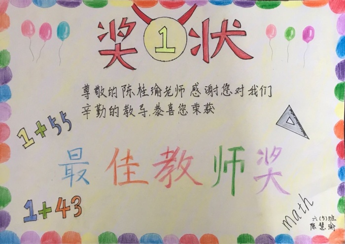 在隊(duì)員們成長(zhǎng)的日子里,老師給他們頒發(fā)了一個(gè)個(gè)獎(jiǎng)狀,記錄下了隊(duì)員的進(jìn)步的足跡。在學(xué)校大隊(duì)部的組織下,全體隊(duì)員利用前幾天的休息時(shí)間,精心為老師們?cè)O(shè)計(jì)了一張張獨(dú)特的獎(jiǎng)狀:最溫柔老師獎(jiǎng)、故事大王獎(jiǎng)、最幽默教師獎(jiǎng)、千山萬水旅行獎(jiǎng)等等。