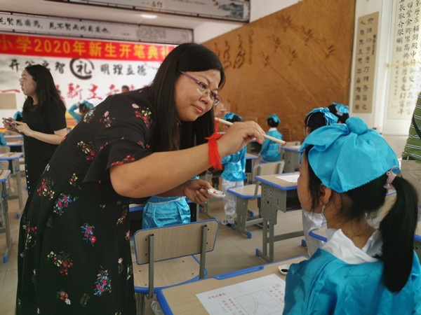 吳校長(zhǎng)帶領(lǐng)著學(xué)校老師俯下身依次在每一個(gè)孩子的額頭正中央點(diǎn)一顆紅痣?!梆搿蓖ā爸恰?,意為開啟智慧,蘊(yùn)含著對(duì)新生們的美好期許。艷麗的朱砂不僅點(diǎn)新生的額頭上,更深深地印在了他們的心中。學(xué)校還邀請(qǐng)已退休教師董印生回校,為新生們擊鼓三聲,寓意深刻。