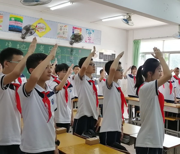 接著,全體隊(duì)員重溫入隊(duì)誓詞,由離隊(duì)隊(duì)員代表初二(8)班白軒怡同學(xué)發(fā)言,她說(shuō):“回顧在少先隊(duì)的日子,是難忘而快樂(lè)的。忘不了在入隊(duì)儀式上,我們莊嚴(yán)的宣誓;忘不了那已行過(guò)無(wú)數(shù)次的少先隊(duì)隊(duì)禮;忘不了那已在胸前佩戴過(guò)無(wú)數(shù)次的鮮艷的紅領(lǐng)巾……"