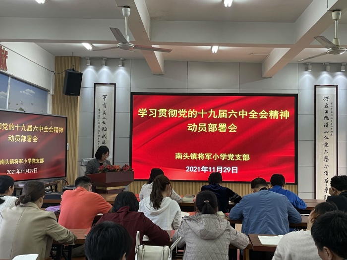 為認(rèn)真學(xué)習(xí)貫徹黨的十九屆六中全會(huì)精神,把黨史學(xué)習(xí)教育不斷引向深入,11月29日下午,南頭鎮(zhèn)將軍小學(xué)黨支部召開(kāi)學(xué)習(xí)貫徹黨的十九屆六中全會(huì)精神動(dòng)員部署會(huì)。本次會(huì)議由學(xué)校黨支部書(shū)記胡映芬校長(zhǎng)主持,全體黨員參與其中。