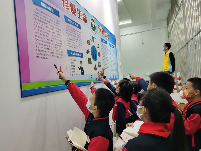 在活動中,學生們在禁毒體驗教育基地工作人員的帶領(lǐng)下,參觀體驗了模擬法庭、模擬KTV涉毒場景、審訊室、監(jiān)獄體驗室等活動,并在活動環(huán)節(jié)中普及毒品危害的知識,甚至還通過VR等形式讓學生切身體會到了吸食毒品后身體出現(xiàn)的不良反應。豐富生動的活動形式,讓學生們參與互動的同時,也收獲了禁毒知識。禁毒體驗教育基地的工作人員不僅耐心地為前來參觀的學生介紹了搖頭丸、大麻、K粉、神仙水、海洛因等不同毒品樣本,還帶領(lǐng)他們依次參觀了各種毒品仿真樣品、吸毒工具、毒品的危害、如何預防毒品圖片展示區(qū)域,給學生們帶來最直觀、最深刻的視覺刺激,讓他們更深入地了解毒品的危害。