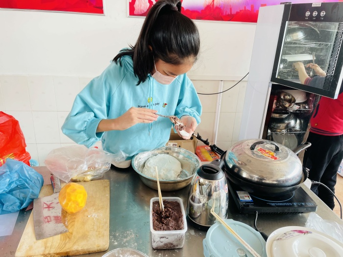 熟悉操作步驟后,同學們開始馬不停蹄地實踐起來。他們按照步驟先把糯米粉和開水調(diào)和成面團,小心翼翼地放入豆沙餡料,再把面團輕輕搓成一個個小圓球。慢慢地,學生們都掌握了包湯圓的技巧,手上的動作越來越快,勞動的成就感油然而生。