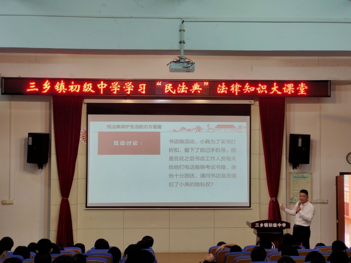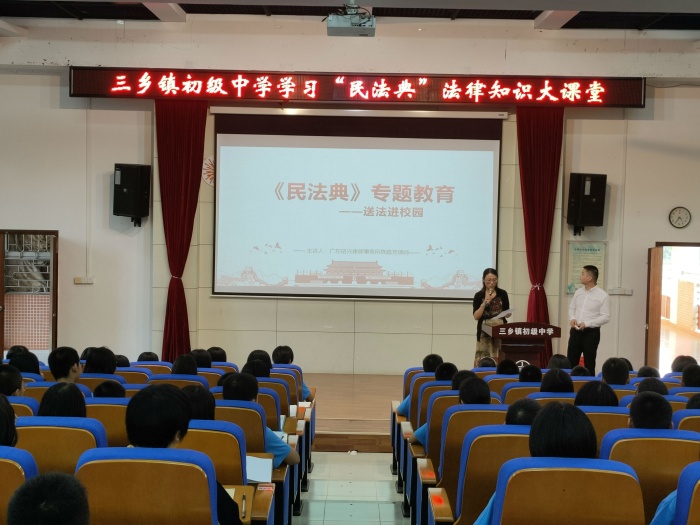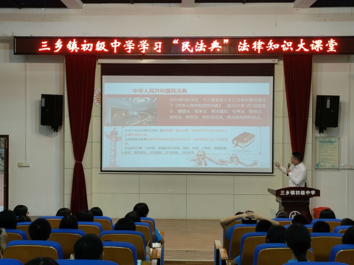 為了深入貫徹落實(shí)三鄉(xiāng)鎮(zhèn)關(guān)于廣泛開展“民法典”普法宣傳的工作精神,引導(dǎo)師生充分認(rèn)識頒布實(shí)施《民法典》的重大意義,提高學(xué)生自覺遵法守法用法的能力,共同構(gòu)建法治校園,三鄉(xiāng)中學(xué)于11月4日下午,邀請廣東銘興律師事務(wù)所陳路芳律師在二樓階梯教室,對七、八年級的兩百余名學(xué)生開展了題為“《民法典》專題教育—送法進(jìn)校園”普法的宣傳講座。