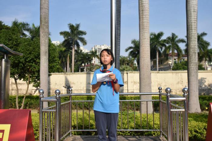 出旗完畢,主持人充滿力量與激情的話語,點燃著每一位先鋒隊員的熾熱內(nèi)心,她滿懷激情地說“我們的隊旗高高飄揚,星星火炬閃耀著金光,我們的隊歌鏗鏘而嘹亮,召喚著伙伴響徹四方!”接著,少先隊員們內(nèi)心激動,以最嘹亮的聲音共同奏唱中國少年先鋒隊隊歌,他(她)們在歌聲中唱出熱情、理想和信念。