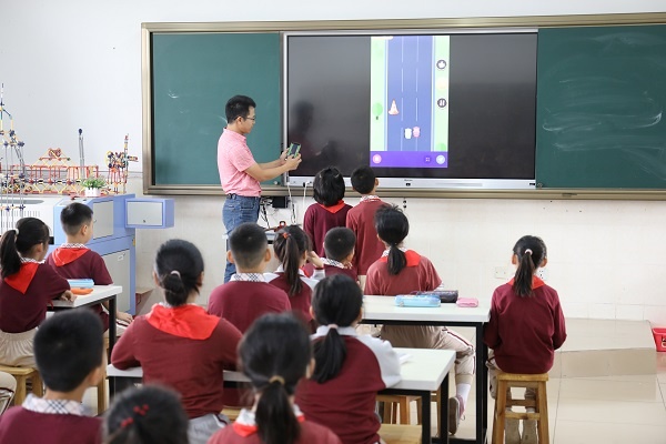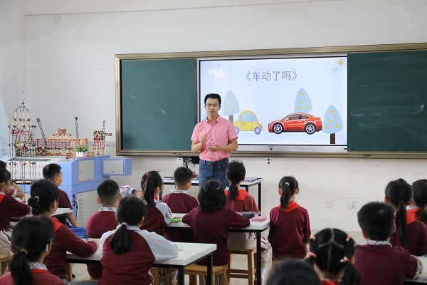 第三節(jié)課由豐華學校陳小樂老師展示四年級科學《車動了嗎》。陳老師充分結合信息技術手段和多媒體技術,讓學生體驗并觀察其自制的賽車小游戲,學生在有趣的游戲中發(fā)現(xiàn)參照物改變,物體的運動狀態(tài)也會改變。接著,陳老師模擬人在公交車上的場景,讓學生分析并模擬場景,結合投屏、攝影等手段讓學生在活動中理解了“運動”的條件。