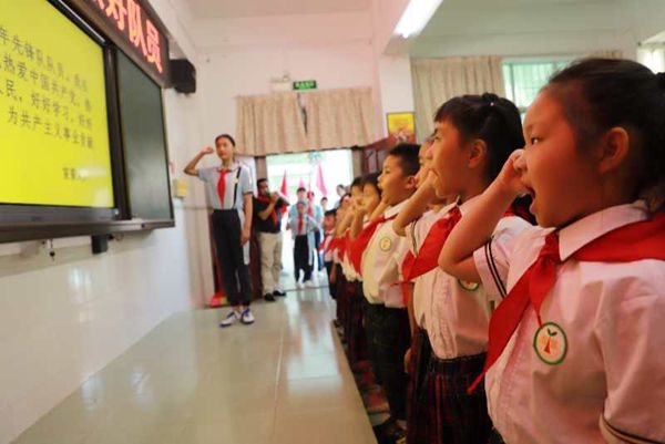 接著,由大隊長帶領(lǐng)全體新隊員面向隊旗,莊嚴(yán)宣誓。隊旗下,一張張稚嫩的面孔,在紅領(lǐng)巾的照耀下,散發(fā)出圣潔的光芒;一聲聲童音,在莊嚴(yán)的誓詞中,透著嚴(yán)肅與堅定。
