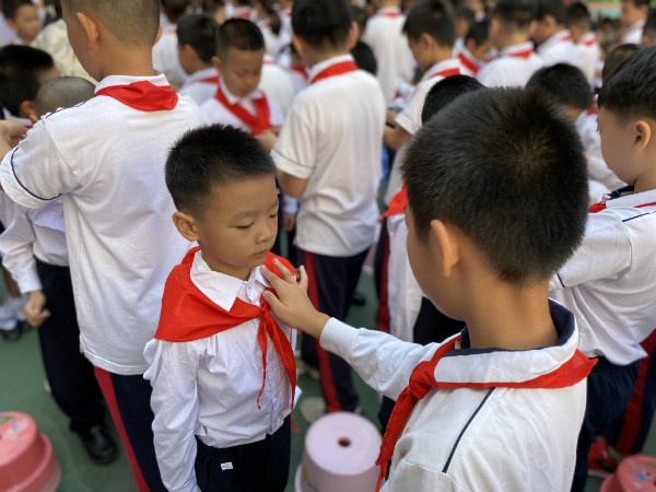 據(jù)了解,入隊儀式前,學(xué)校少工委在二年級學(xué)生中做了一個關(guān)于少先隊員“六知六會”的知識小調(diào)查,內(nèi)容包括說、唱、戴、練。此外,鐘鵬東老師還從系紅領(lǐng)巾、敬隊禮、呼號、宣誓等方面對他們進行了專門培訓(xùn)。學(xué)生們學(xué)習(xí)后,對紅領(lǐng)巾漸漸有了崇敬感和使命感,紛紛遞交入隊申請書,爭做優(yōu)秀的少先隊員。