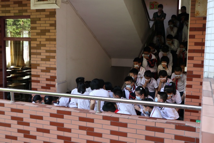 上午9點,伴隨一陣急促的警報聲,演練正式開始。在各班班主任的指揮下,各樓層學(xué)生生成兩路縱隊,按規(guī)劃好的疏散線路下樓,師生們嚴格按照火場逃生疏散演練技巧,以及 “手捂口鼻、貓腰、靠墻、降低重心、靠右走”的要求,有秩序地從教學(xué)大樓疏散。隨著各班班主任清點人數(shù),并層層上報,全校師生全部安全疏散完畢。