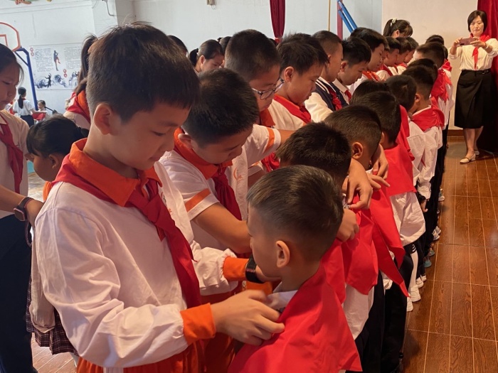 最激動人心的時刻到了,大隊委員代表陳凱文同學(xué)宣讀入隊名單,高亢激昂的紅領(lǐng)巾之歌響徹全場,二年級的同學(xué)們排著整齊的隊伍,懷著無比激動的心情,笑容滿面地走上舞臺,帶著期待的眼神,等待老隊員為他們佩戴上盼望已久的紅領(lǐng)巾。當他們和老隊員互敬隊禮的那一刻,驕傲而又自豪的心情在他們的心頭激蕩。