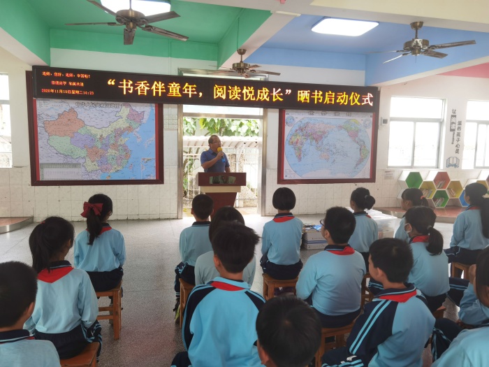 首先進行的是曬書啟動儀式。由教師代表肖穎老師發(fā)出“捐兩本,讀百本”曬書活動倡議;學生代表六(1)班的古圣堡同學向同學們介紹多讀書的益處;馬校長在致辭中提出一個希望:希望從現(xiàn)在開始,同學們能全身心地投入到讀書活動中,讓知識伴隨同學們走好人生的每一步。該校一直以來,十分注重培養(yǎng)學生的閱讀習慣,過去一學年,學校為各圖書角增添一萬多元的圖書,還增設了一個 “隊長書吧”,讓同學們在放學等候父母接送的時候,自主閱讀。