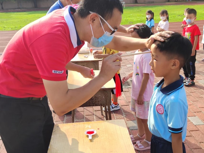 在點朱砂環(huán)節(jié),由校長范田華、德育主任張超金、教導(dǎo)主任文學(xué)平組成的領(lǐng)導(dǎo)小組為一年級學(xué)生點朱砂,寓意:開啟智慧,希望孩子們眼明心亮。范校長、張主任、文主任以和藹的笑容,給新生們送上祝福的話語。