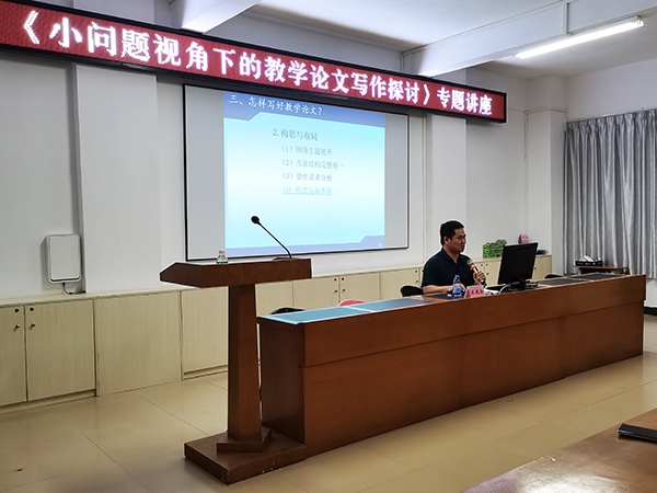 針對教師們在論文撰寫中的薄弱環(huán)節(jié)及撰寫過程中存在的諸多問題,張主任以幽默風(fēng)趣的語言,與老師們一起探討“小問題視角下的教學(xué)論文寫作”, 為老師們的論文撰寫支妙招。他先講述在他眼中什么是“小問題”以及“小問題”從何而來?讓老師們在平時(shí)要留心觀察與學(xué)生在一起時(shí)出現(xiàn)的各種教育問題,并積極思考、反思問題解決的措施等,這些豐富的教育實(shí)踐,能為論文寫作積累豐富的素材。接著,張主任結(jié)合自己撰寫論文的經(jīng)驗(yàn),用一個(gè)個(gè)真實(shí)的教學(xué)案例和育人故事深入淺出地為老師們闡述了一篇高質(zhì)量論文是如何誕生的。從選題視角到論文的論點(diǎn),從論證材料的選擇到論文的結(jié)構(gòu)安排,甚至是論文的格式規(guī)范等等,張主任都一一向老師們做了具體解讀。兩個(gè)多小時(shí)的培訓(xùn)干貨滿滿,讓在場的老師獲益良多。