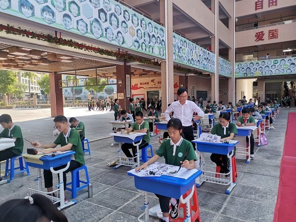 參加現(xiàn)場書法展示的為學(xué)校中小學(xué)書法社團(tuán)成員,場地分為大字展示區(qū)和常規(guī)書寫展示區(qū),場面蔚為壯觀。教學(xué)樓下630平方米的地面上鋪著紅毯,25名同學(xué)拿著大毛筆行走于白紙之間揮毫,進(jìn)行書法創(chuàng)作。常規(guī)書寫展示區(qū)的44名同學(xué)滿懷激情,用心書寫每一個筆畫、每一個漢字,盡其所能展示自己的書寫水平。作品透著或規(guī)范、或嚴(yán)謹(jǐn)、或靈動的氣質(zhì)。書寫內(nèi)容基本選自紀(jì)念珠江縱隊成立五十周年專輯《五桂烽火》中的詩句。詩句激勵著五桂學(xué)子書英烈、學(xué)英雄?;顒又?,陳玉玲副校長為大家現(xiàn)場展示書法,鼓勵鞭策在場的同學(xué)們寫好中國字,做好中國人。整個活動,同學(xué)們認(rèn)真品味著書法的藝術(shù)魅力,飽蘸濃墨、激揚(yáng)文字。“書道雖深,志誠可達(dá)”,同學(xué)們?nèi)褙炞?,將身心融于筆端,揮灑書寫之豪氣,一撇一捺,起轉(zhuǎn)鋒回,字字溢香。