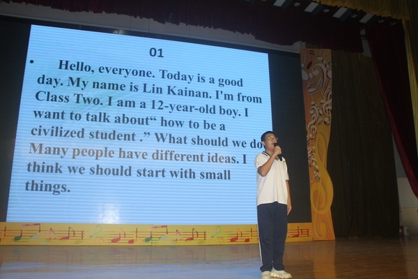這兩次創(chuàng)文英語演講比賽,各年級都有10位選手參賽,由各班推選而出。他們都制作了演講課件,圍繞“為創(chuàng)建文明城市做貢獻”主題,層次清晰,詳略得當,具有縝密的思維及邏輯性,格調(diào)積極向上,角度多方多面。參賽同學的演講,都具有真情實感,做到脫稿演講,吐字清晰,英文發(fā)音標準,表達流暢、生動,語速適中,語調(diào)抑揚頓挫,飽含感情。他們儀表端莊,表情自然,形體動作大方得體,頗具現(xiàn)場感染力,臺下同學時常報以掌聲共鳴。