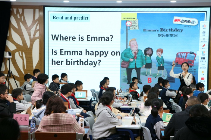 朱洛璇老師執(zhí)教的課例是六年級英語《Emma’s birthday》。她的教學(xué)設(shè)計十分精彩,分為三大板塊,一是故事讀前激活,將學(xué)習(xí)內(nèi)容和現(xiàn)實生活關(guān)聯(lián)促進(jìn)學(xué)生對知識的深層理解;二是故事讀中交流,通過技術(shù)支持的課堂講授和多技術(shù)融合的教學(xué)方法和策略,讓學(xué)生充分參與課堂;三是故事讀后分享,學(xué)以致用。