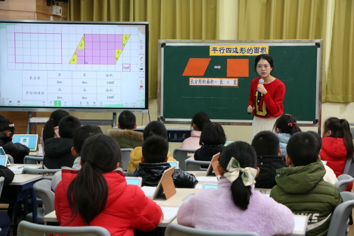 教研員李銳翀則對胡老師的數(shù)學(xué)課展開評價。他指出,該課突破了重難點,激活了學(xué)生的思維。在信息技術(shù)進(jìn)行高效教學(xué)活動中,長方形的長和寬與平行四邊形底和高的關(guān)系是一個難點,需要學(xué)生在探索活動中由淺入深地進(jìn)行觀察,從而使學(xué)生進(jìn)一步理解平面圖形之間的變換關(guān)系,發(fā)展空間觀念。