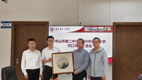 最后,翁傳斌校長代表該校向中山市第二中學(xué)贈送一幅精美的寓意深刻的潮繡作品《荷》。該作品為磷溪中學(xué)鄭煜玲老師手繡,絲絲入扣,精工細(xì)作,“荷花”與二中特色景觀“荷”相呼應(yīng),寄托了磷溪中學(xué)對中山二中的深厚情感與美好祝愿。中山市第二中學(xué)向磷溪中學(xué)贈與“互幫互學(xué),攜手共進(jìn)”紀(jì)念牌匾。
